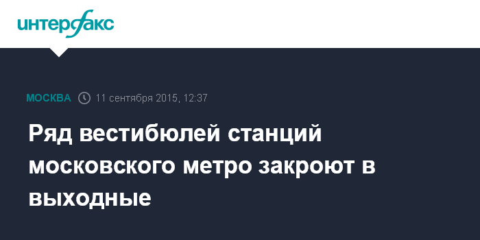 Москва. 11 сентября. INTERFAX.RU - Несколько вестибюлей станций столичного метро будут закрыты в предстоящие выходные в рамках программы благоустройства, сообщает твиттер метрополитена.