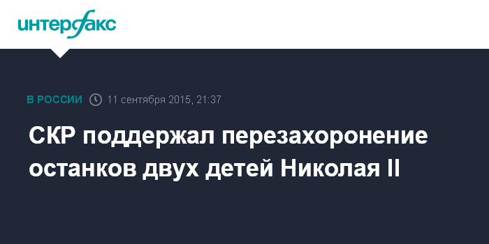 Москва. 11 сентября. INTERFAX.RU - Следственный комитет России поддерживает инициативу захоронить останки цесаревича Алексея и великой княжны Марии, которые в настоящее время хранятся в Госархиве РФ.