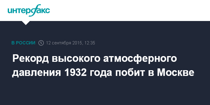 Москва. 12 сентября. INTERFAX.RU - По данным барометра на базовой московской метеостанции на ВДНХ, в 10:00 субботы было зафиксировано значение атмосферного давления на уровне 763 мм ртутного столба, сообщает портал "Метеоновости".