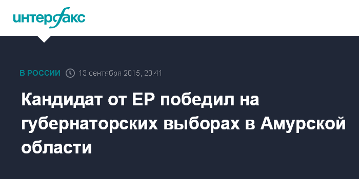 Москва. 13 сентября. INTERFAX.RU - По итогам подсчета 100% протоколов участковых избирательных комиссий на выборах губернатора Амурской области победил Александр Козлов ("Единая Россия").