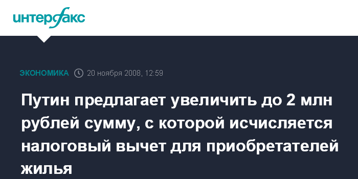 Москва. 20 ноября. INTERFAX.RU - В РФ задним число с 1 января 2008 года в два раза, до 2 млн рублей, увеличивается сумма, с которой исчисляется налоговый вычет для приобретателей жилья, заявил премьер-министр РФ, председатель партии "Единая Россия" на 10 съезде партии в четверг.