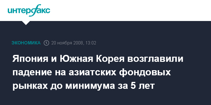 Москва. 20 ноября. INTERFAX.RU - Фондовые индексы Японии и Южной Кореи обвалились более чем на 6% в четверг, возглавив падение на азиатских рынках акций на фоне сокращения японского экспорта и рекордного снижения потребительских цен в США, сообщило агентство Bloomberg.