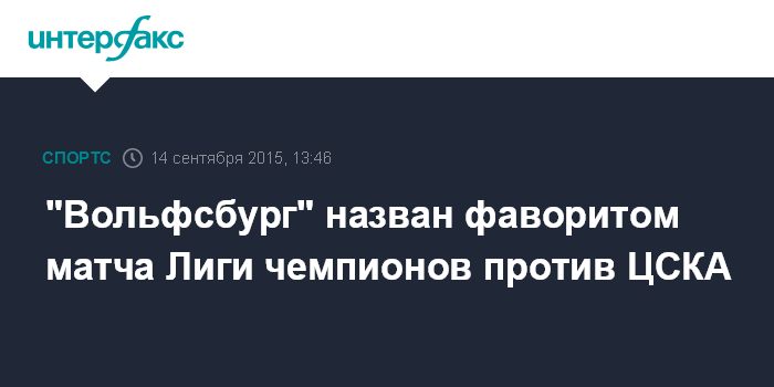 Москва. 14 сентября. INTERFAX.RU - Немецкий футбольный клуб "Вольфсбург" является фаворитом матча первого тура группового этапа Лиги чемпионов УЕФА против московского ЦСКА, свидетельствуют котировки британской букмекерской конторы William Hill.