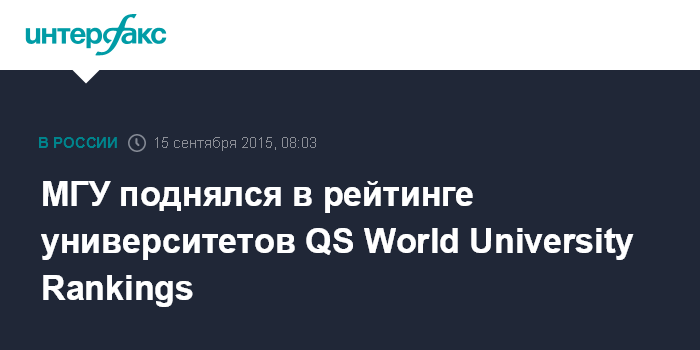 Москва. 15 сентября. INTERFAX.RU - В престижном мировом рейтинге университетов QS World University Rankings, опубликованном в ночь на вторник на сайте QS, МГУ им. М.В.Ломоносова поднялся на шесть позиций.