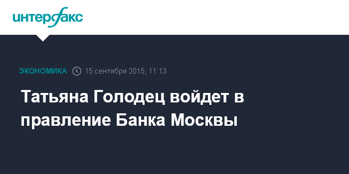 Москва. 15 сентября. INTERFAX.RU – Совет директоров Банка Москвы утвердил кандидатуру Татьяны Голодец для избрания на должность члена правления банка, говорится в сообщении кредитной организации.