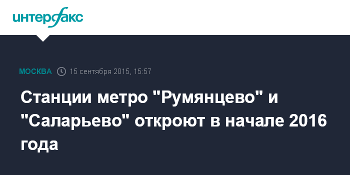 Москва. 15 сентября. INTERFAX.RU - Станции "Румянцево" и "Саларьево" Сокольнической линии столичного метро на территории "новой" Москвы планируют открыть в начале следующего года, сообщил заместитель мэра города по вопросам градостроительной политики и строительства Марат Хуснуллин.