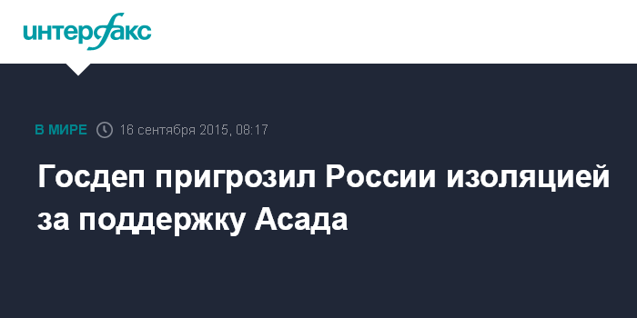 Москва. 16 сентября. INTERFAX.RU - Если Россия продолжит поддержку режима президента Сирии Башара Асада, Вашингтон может применить механизмы для ее "дальнейшей изоляции", заявил во вторник представитель госдепа Джон Кирби.