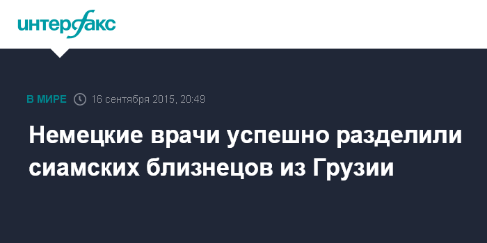 Москва. 16 сентября. INTERFAX.RU - В детской клинике в Кельне немецкие хирурги провели успешную операцию по разделению двух шестимесячных сиамских близнецов из Грузии, сообщают в среду грузинские СМИ.