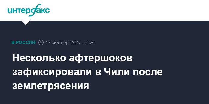 Москва. 17 сентября. INTERFAX.RU - Несколько подземных толчков магнитудой от 5,5 до 6,4 зафиксировано у берегов и на территории Чили после мощного землетрясения, произошедшего в 01:54 мск в четверг у побережья этого южноамериканского государства, сообщает Геофизическая служба Сибирского отделения РАН.
