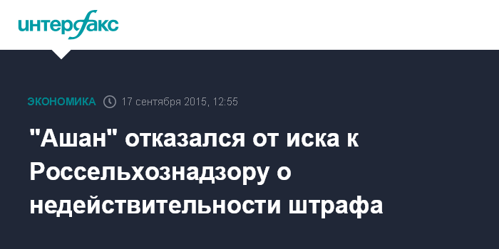 Москва. 17 сентября. INTERFAX.RU – Ритейлер "Ашан" отказался от иска к Россельхознадзору о недействительности штрафа в размере 500 тыс. рублей, сообщил корреспондент "Интерфакса" из суда. В связи с этим суд прекратил производство по делу.