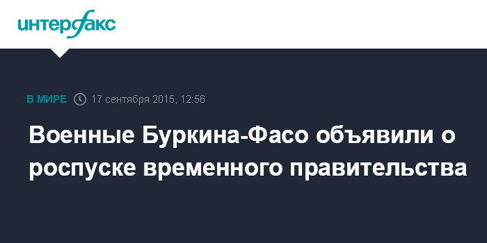 Москва. 17 сентября. INTERFAX.RU - Войска охраны президента Буркина-Фасо объявили в четверг о роспуске временного правительства, сообщает "Би-би-си".