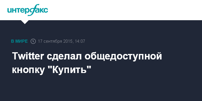 Москва. 17 сентября. INTERFAX.RU - Компания Twitter сделала общедоступной во всем мире кнопку "Купить"(Buy) в своей социальной сети. Ранее кнопка была доступна только определенным пользователям на территории США, сообщил во вторник сайт Mashable.