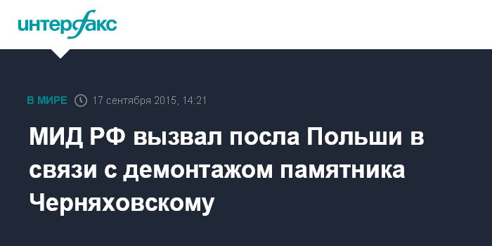 Москва. 17 сентября. INTERFAX.RU - Посла Польши в Москве вызвали в МИД России в связи с демонтажем памятника советскому генералу Ивану Черняховскому, сообщила пресс-служба российского внешнеполитического ведомства.