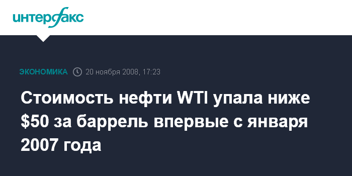 Москва. 20 ноября. INTERFAX.RU - Стоимость нефти WTI на Нью-йоркской товарной бирже (NYMEX) упала в четверг ниже $50 за баррель впервые с января 2007 г. на фоне рецессии в США, Европе и Японии, способствующей сокращению спроса на топливо, сообщает агентство Bloomberg.