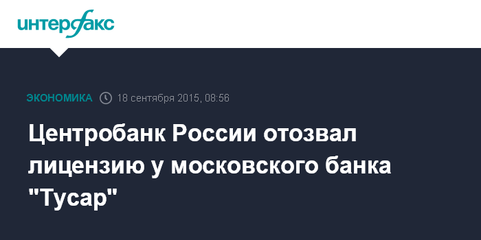 Москва. 18 сентября. INTERFAX.RU - Центральный банк России (ЦБ РФ) отозвал лицензию на осуществление банковских операций у банка "Тусар" (Москва), говорится в сообщении Центробанка.