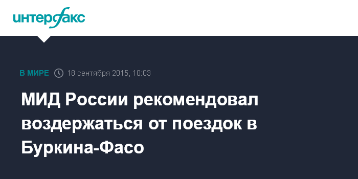 Москва. 18 сентября. INTERFAX.RU - МИД РФ призывает россиян отказаться от поездок в Буркина-Фасо, пока ситуация в этой африканской стране не стабилизируется.