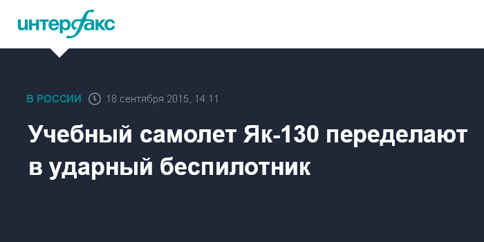 Москва. 18 сентября. INTERFAX.RU - Учебно-боевой самолет Як-130 может быть переделан в ударный беспилотный летательный аппарат, который по своей тяговооруженности и универсальности будет превосходить американский MQ-9 Reaper, сообщает N+1 со ссылкой на советника первого заместителя генерального директора концерна "Радиоэлектронные технологии" Владимира Михеева.
