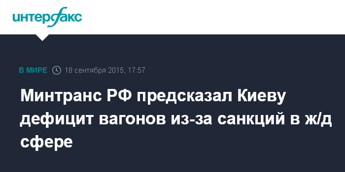 Москва. 18 сентября. INTERFAX.RU - Санкции украинских властей в отношении российских железнодорожных операторов вызовут у них опасения насчет отправки вагонов на Украину, что приведет к их дефициту в это стране, считает министерство транспорта РФ.