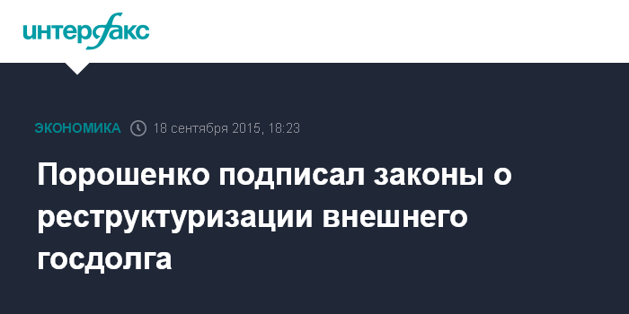 Москва. 18 сентября. INTERFAX.RU - Президент Украины Петр Порошенко подписал принятые Верховной радой в четверг законы, которые предусматривают реструктуризацию государственного долга страны.