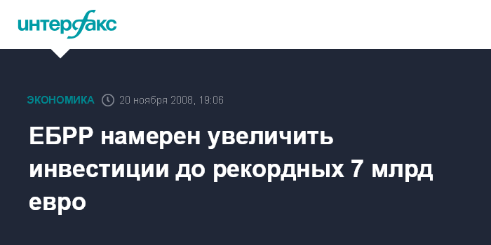 Москва. 20 ноября. INTERFAX.RU - Европейский банк реконструкции и развития (ЕБРР) намерен увеличить инвестиции в 2009 г. на 20% по сравнению с первоначальным планом - до 7 млрд евро. Это максимальный показатель за всю историю существования ЕБРР, говорится в сообщении банка.