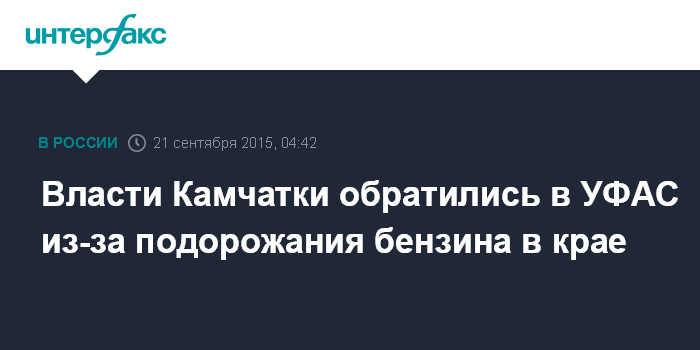 Москва. 21 сентября. INTERFAX.RU - Врио губернатора Камчатского края Владимир Илюхин обратился в УФАС с просьбой проверить обоснованность очередного повышения цен на бензин в регионе, сообщает пресс-служба краевого правительства.