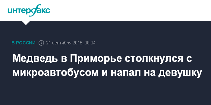 Москва. 21 сентября. INTERFAX.RU – Гималайский медведь столкнулся с микроавтобусом на одной из центральных улиц в приморском поселке Кировский, после чего напал на девушку.