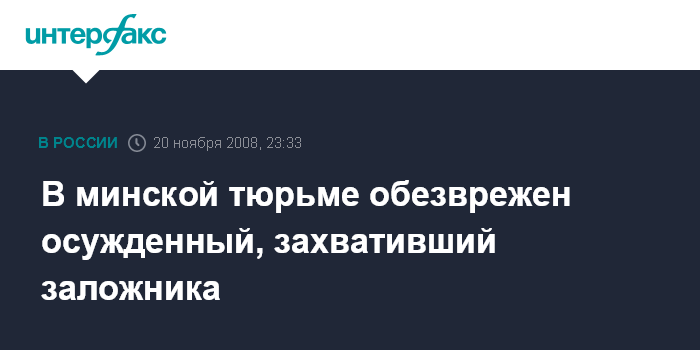 Минск. 20 ноября. ИНТЕРФАКС-ЗАПАД - В исправительном учреждении номер 1 в Минске один из осужденных захватил в заложники медсестру, сообщает Первый национальный телеканал Белоруссии.