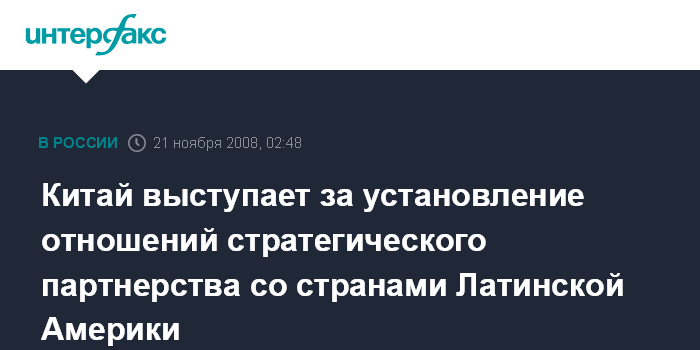 Пекин. 21 ноября. ИНТЕРФАКС-КИТАЙ - Китай считает необходимым в нынешних международных условиях развивать со странами Латинской Америки отношения стратегического партнерства, заявил в четверг председатель КНР Ху Цзиньтао.