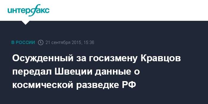 Москва. 21 сентября. INTERFAX.RU - Приговоренный к 14 годам лишения свободы за госизмену бывший военнослужащий Вооруженных Сил России Геннадий Кравцов передал в Швецию информацию о деятельности российской космической разведки, сообщает в понедельник ЦОС ФСБ России.