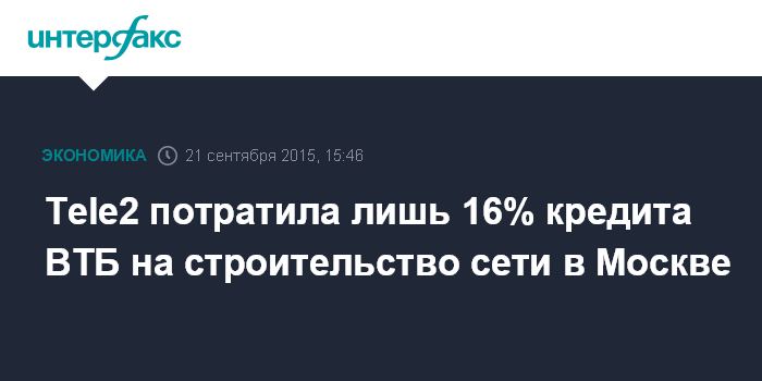Москва. 21 сентября. INTERFAX.RU – ООО "Пилар" ("дочка ООО "Т2 РТК Холдинг", оператора Tele2) к середине сентября выбрало 2,6 млрд рублей из льготного кредита ВТБ на 16 млрд рублей, предоставленного оператору по механизму проектного финансирования на строительство сети в Москве.