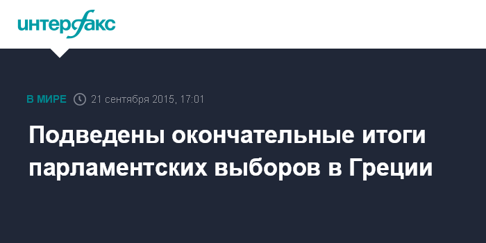 Москва. 21 сентября. INTERFAX.RU - Власти Греции завершили подсчет голосов на досрочных парламентских выборах, по результатам которых коалиция СИРИЗА набрала 35,46% и одержала победу, получив 145 депутатских мандатов, сообщает в понедельник интернет-портал греческой газеты "Катимерини".