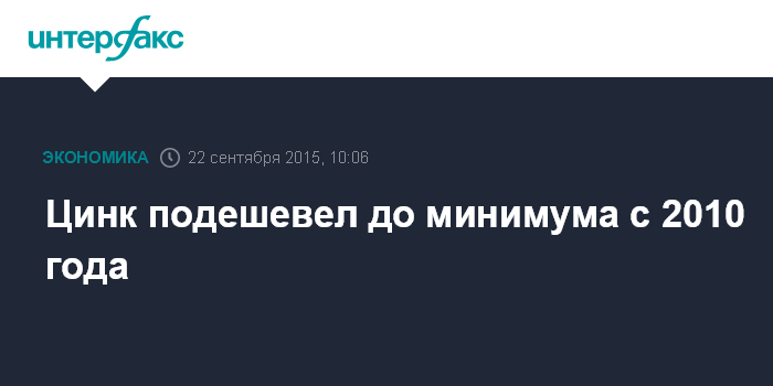 Москва. 22 сентября. INTERFAX.RU - Цинк на торгах в понедельник подешевел до минимума более чем за пять лет, его стоимость продолжила снижение во вторник на фоне растущих товарных запасов по всему миру.