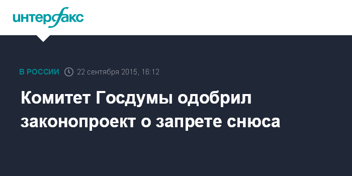 Москва. 22 сентября. INTERFAX.RU - Комитет Госдумы по охране здоровья во вторник рекомендовал принять в первом чтении законопроект о запрете продажи сосательного табака (снюса).