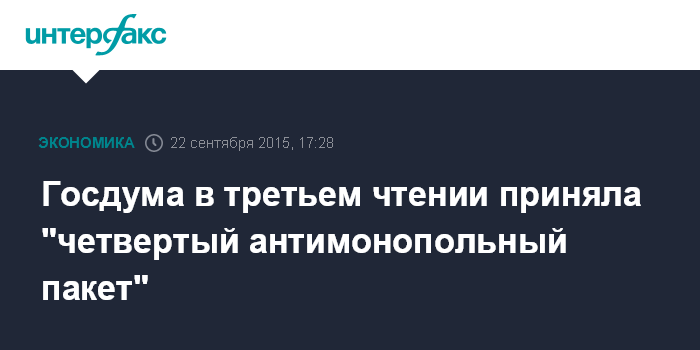 Москва. 22 сентября. INTERFAX.RU – Госдума на заседании во вторник приняла в окончательном чтении поправки в закон "О защите конкуренции", так называемый "четвертый антимонопольный пакет".
