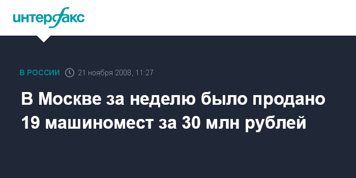 Москва. 21 ноября. INTERFAX.RU - В течение последней недели в столице было продано 19 машиномест, сообщили "Интерфаксу" в пятницу в департаменте имущества города.