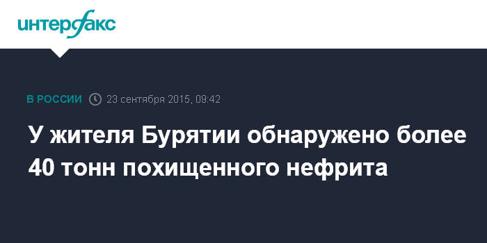 Москва. 23 сентября. INTERFAX.RU - В Бурятии изъято более 40 тонн нефрита, предположительно похищенного у одного из крупнейших нефритодобывающих предприятий, сообщила в среду официальный представитель МВД России Елена Алексеева.