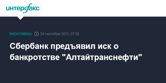 Москва. 24 сентября. INTERFAX.RU - Сбербанк России предъявил иск о банкротстве ООО "Алтайтранснефть" (республика Алтай), говорится в материалах Арбитражного суда республики Алтай.