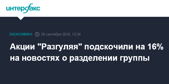 Москва. 24 сентября. INTERFAX.RU – Акции "Группы "Разгуляй" днем в четверг подскочили на 16% и достигли уровней конца июня на корпоративных новостях о планах разделения предприятия.