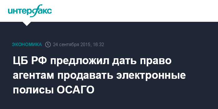 Москва. 24 сентября. INTERFAX.RU - Банк России предложил дать право агентам страховых компаний и страховых брокеров продавать электронные полисы ОСАГО, сообщил представитель департамента страхового рынка ЦБ РФ Всеволод Журавлев на конференции по цифровым технологиям страхования. Предложение об этом направлено в Минфин РФ.