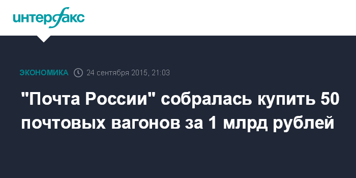 Москва. 24 сентября. INTERFAX.RU – "Почта России" объявила два аукциона на поставку 50 багажно-почтовых вагонов на общую сумму 1 млрд рублей, следует из материалов компании на сайте госзакупок.