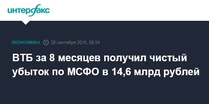 Москва. 28 сентября. INTERFAX.RU – Банк ВТБ получил чистый убыток по международным стандартам (МСФО) за 8 месяцев 2015 года в размере 14,6 млрд рублей, говорится в сообщении банка.