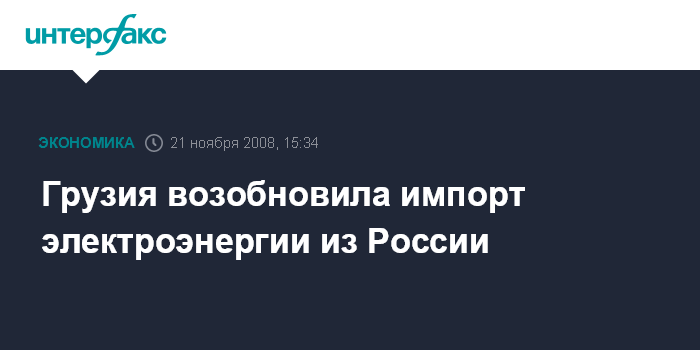 Москва. 21 ноября. INTERFAX.RU – Грузия возобновила импорт электроэнергии из России, сообщила "Интерфаксу" руководитель службы по связям с общественностью ООО "Коммерческий оператор электроэнергетической системы Грузии" Ани Брегвадзе.