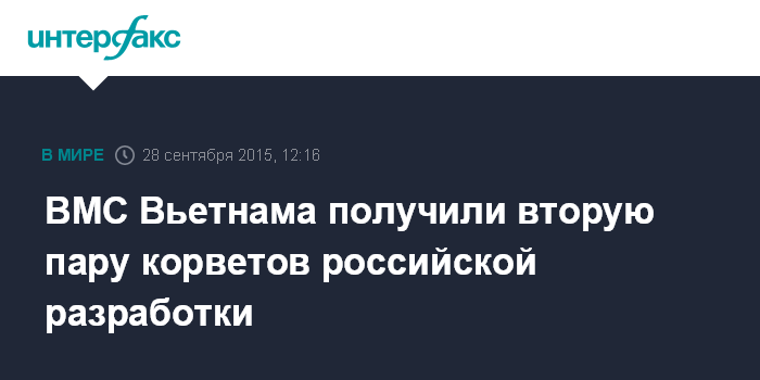 Москва. 28 сентября. INTERFAX.RU - Вторая пара ракетных корветов проекта 1241.8 разработки Центрального морского конструкторского бюро "Алмаз" была передана ВМС Вьетнама, сообщил в понедельник "Интерфаксу" источник в российской кораблестроительной отрасли.