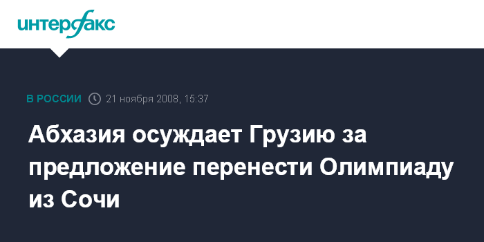 Москва. 21 ноября. INTERFAX.RU – Министр иностранных дел Абхазии Сергей Шамба назвал очередной провокацией Тбилиси обращение Грузии к Международному олимпийскому комитету, в которой содержится просьба перенести зимнюю Олимпиаду 2014 года из Сочи "по соображениям безопасности".