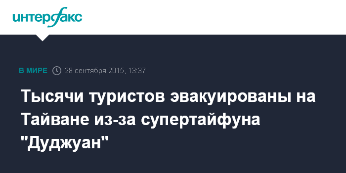 Москва. 28 сентября. INTERFAX.RU - Около трех тысяч человек, большинство из которых туристы, эвакуированы на острове Тайвань из-за надвигающегося супертайфуна Дуджуан, сообщает британское издание The Guardian.