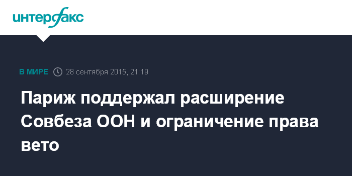 Москва. 28 сентября. INTERFAX.RU - Президент Франции Франсуа Олланд заявил, что Париж выступает за расширение состава Совбеза ООН и ограничение применения права вето.