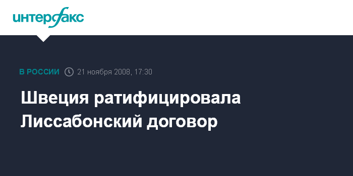Москва. 21 ноября. INTERFAX.RU - Парламент Швеции, Риксдаг, поздно вечером в четверг одобрил Лиссабонский договор, сообщает шведская пресса.