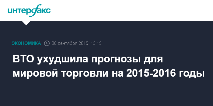 Москва. 30 сентября. INTERFAX.RU – Всемирная торговая организация понизила прогноз роста объема мировой торговли на 2015 год до 2,8% с 3,3%, ожидавшихся в апреле, отметив, что ослабление спроса на импорт в Китае, Бразилии и других emerging markets способствует сокращению объемов экспорта торговых партнеров этих стран.