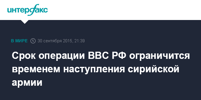 Москва. 30 сентября. INTERFAX.RU - Российские ВВС будут оказывать поддержку наступательной операции сирийских вооруженных сил, этой операцией будет ограничено время их действий в Сирии, заявляют в Кремле.