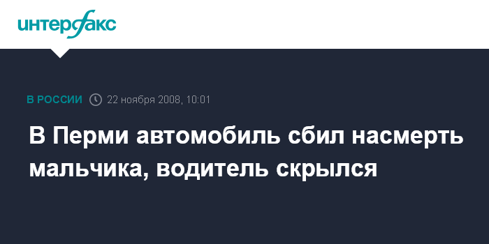 Пермь. 22 ноября. ИНТЕРФАКС-ПОВОЛЖЬЕ - В Орджоникидзевском районе Перми в пятницу вечером автомобиль сбил насмерть 10-летнего мальчика и скрылся, сообщили агентству "Интерфакс-Поволжье" в субботу в ГИБДД Орджоникидзевского района Перми.